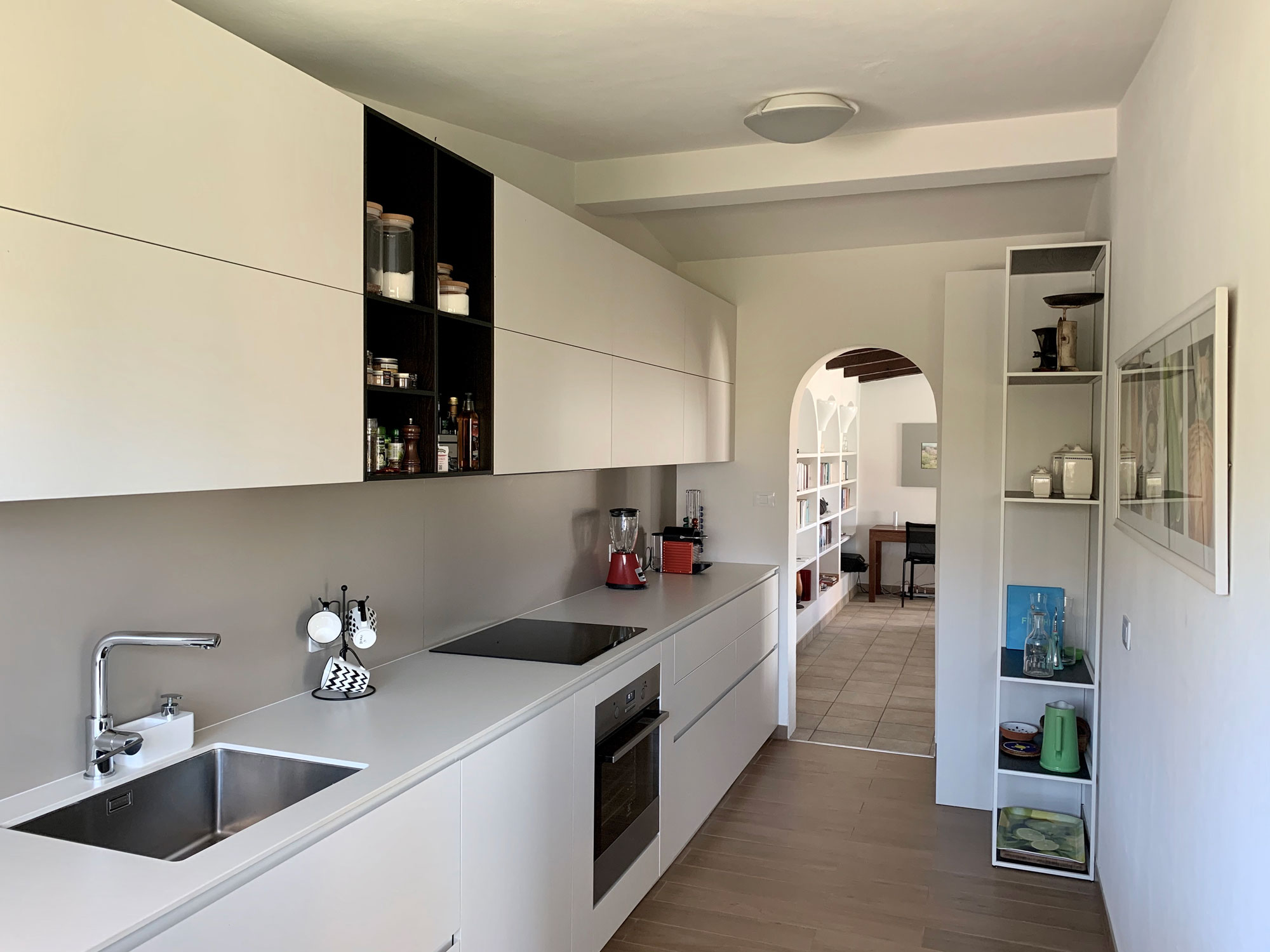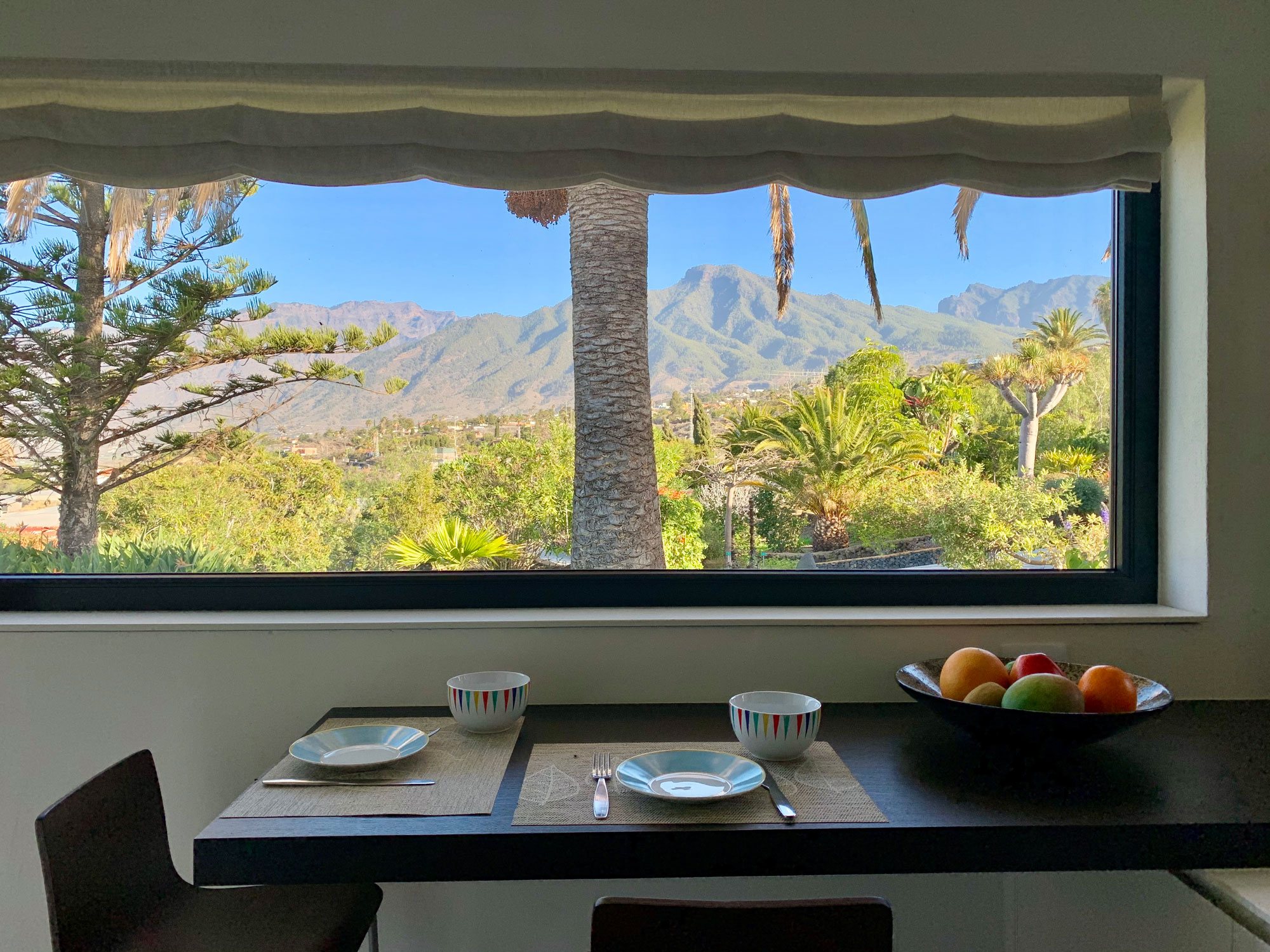 - moderne Küche mit Frühstücksbar und herrlicher Aussicht auf den Garten und die Berge